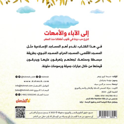 في هذا الكتاب، نقدم أهم المساجد الإسلامية مثل المسجد الأقصى، المسجد الحرام، المسجد النبوي، بطريقة مبسطة وممتعة، تجعلهم يتعرفون عليها ويدركون قيمتها من خلال عبارات جميلة ورسومات ملونة.